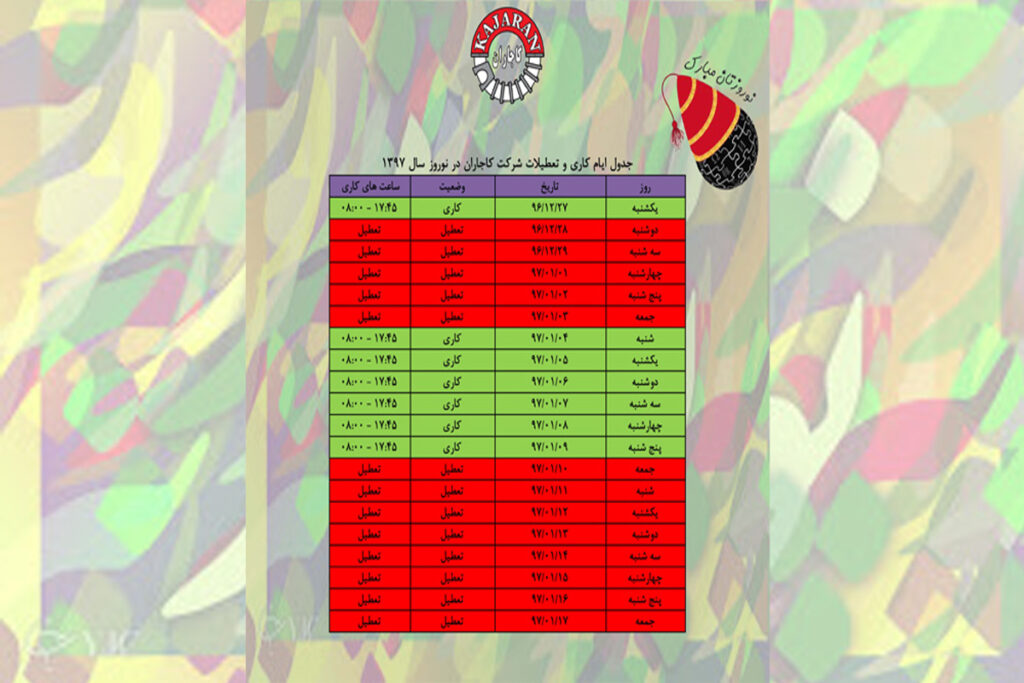 جدول ایام کاری و تعطیلات شرکت کاجاران در نوروز 1397